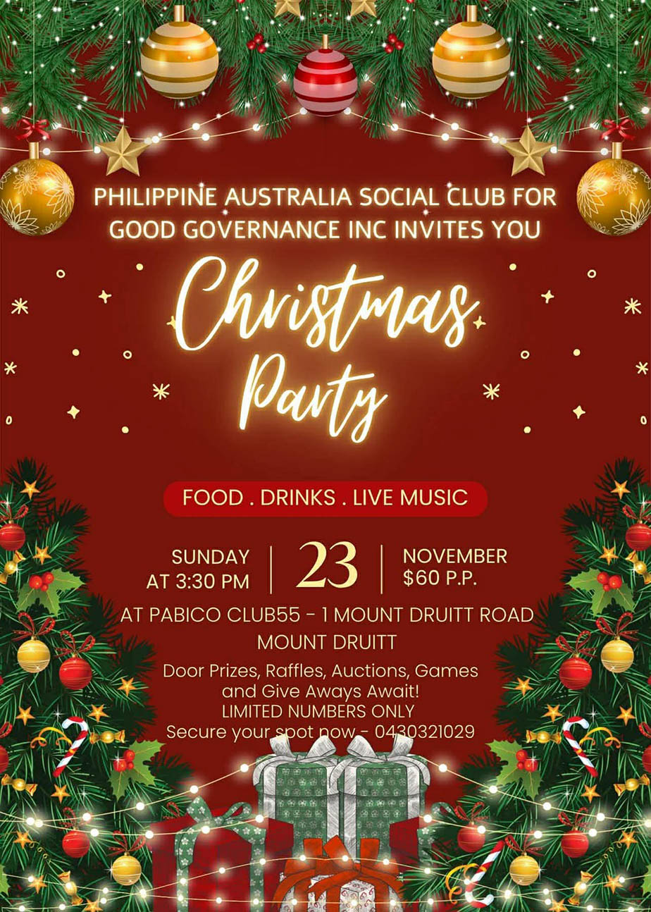 On 23 November 2025, the Filipino-Australian community came together in a remarkable display of unity, generosity, and cultural pride as the Philippine Australian Social Club for Good Governance Incorporated (PASCGGI) hosted its very first Christmas Party at Pabico. The event, filled with camaraderie, entertainment, and community spirit, successfully raised $3,500.00 through a charity auction—funds that have since been channelled to two designated beneficiaries in the Philippines.